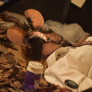 We created all the masks, Alice’s dress and all the background props out of cardboard and plastics. This is due to the climate change crisis present at the moment.